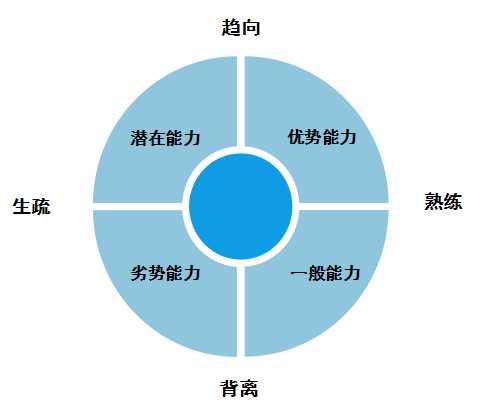 以使用傾向性作為縱坐標(趨向、背離),以熟練程度作為橫坐標(熟練、生疏),就形成了能力鑒別系統。如下圖: