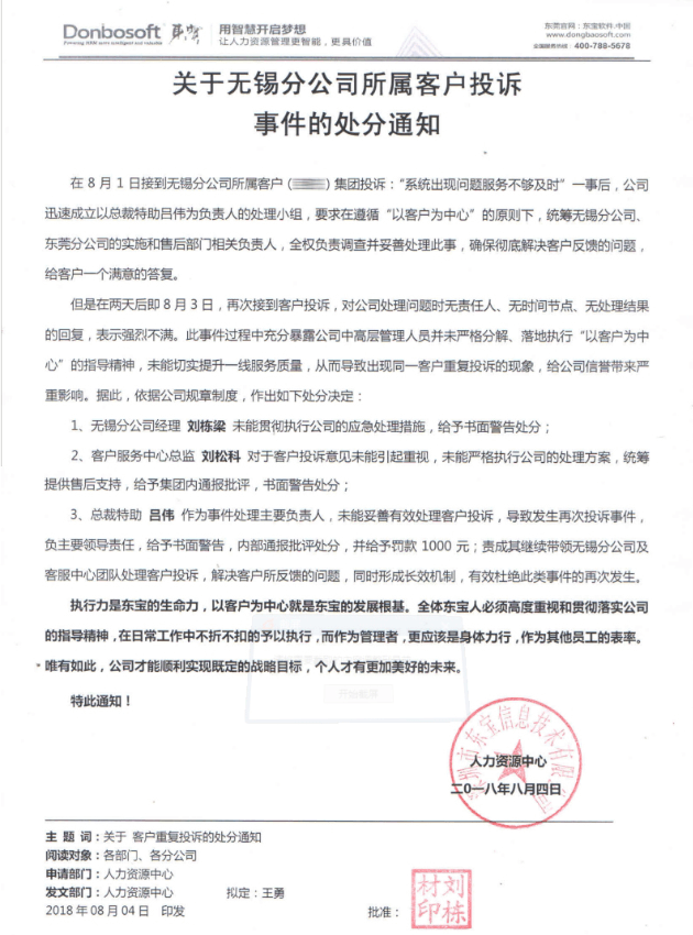 8月1日,東寶集團接到無錫分公司所屬客戶投訴“系統出現問題服務不夠及時”一事,經查屬實后,東寶集團總裁劉棟材先生馬上召開緊急會議,并迅速成立以總裁特助呂偉為負責人的處理小組,統籌無錫分公司、東莞分公司的實施和售后部門相關負責人,全權負責調查并妥善處理客戶投訴一事,確保快速響應、徹底解決客戶所反饋的問題,給客戶一個滿意的答復。
